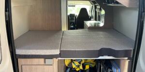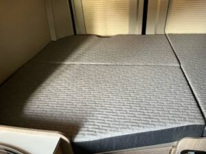 Das fertige Ergebnis für die individuelle Matratze für den Fiat Ducato Pössl Roadcamp 540, den unser Kunde als Wohnmobil nutzt, kann sich sehen lassen. Unser Kunde hatte den Wunsch nach einer stapelbaren Matratze mit unserem Komfort-Bezug. Durch die Stapelfunktion kann sich die Matratze platzsparend im Wohnmobil aufbewahrt werden, somit hat unser Kunde noch viel Platz für Sportequipment, Kisten etc.
