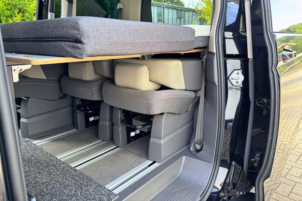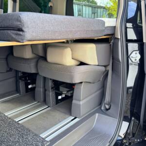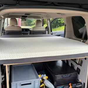 Bitte beachte, dass die Matratze nicht einfach auf die Sitze gelegt werden kann. Man benötigt bei dem T7 Multivan eine Unterkonstruktion, damit die Matratze eben aufliegt.